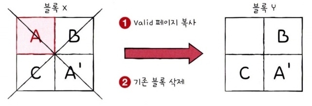 유효한 페이지들을 새로운 블록에 복사하고, 기존 블록은 삭제한다.
