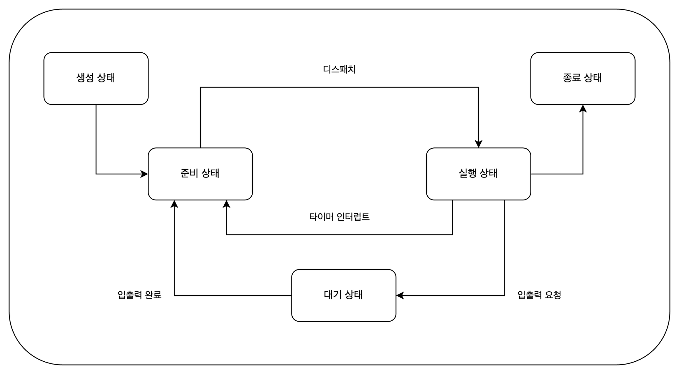 생성 상태: 프로세스를 생성 중인 상태이다. 메모리에 적재되어 PCB를 할당받은 상태이다. 준비 상태: 프로세스가 메모리에 적재되어 CPU를 기다리는 상태이다. 준비 상태인 프로세스가 실행 상태로 전환되는 것을 디스패치(dispatch)라고 한다. 실행 상태: 프로세스가 CPU를 점유하고 명령어를 실행하는 상태이다. 대기 상태: 프로세스가 입출력을 기다리는 상태이다. 입출력이 완료되면 준비 상태로 전환된다. 종료 상태: 프로세스가 실행을 마치고 종료된 상태이다. 운영체제는 PCB와 메모리를 해제한다.