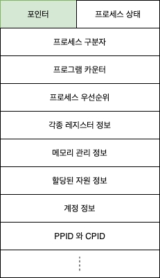 포인터 : PCB의 첫 번쨰 블록에 저장된다. 준비&대기 상태의 큐를 구현할 때 이용한다