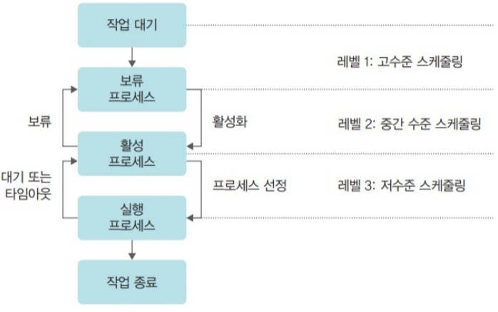 🔴 고수준 스케줄링 가장 큰 틀에서 이뤄지는 스케줄링이다. 시스템의 전체 작업 수를 조절해주며, 작업을 받아 들이거나 거부한다.