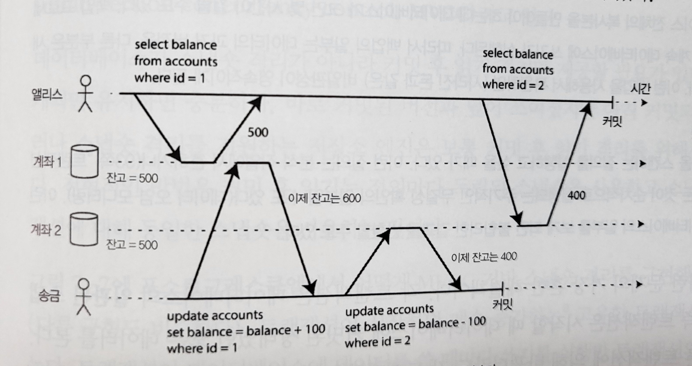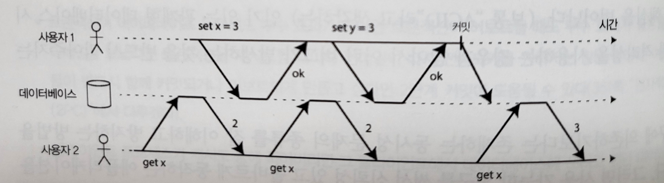 갱신 손실 : 두 트랜잭션이 작업을 동시에 하면 두번째 쓰기 작업이 첫 번째 변경을 포함하지 않으므로 변경 중 하나는 손실될 수 있음