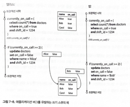 데이터베이스에서 스냅숏 격리를 사용하므로 둘 다 2를 반환해서 두 트랜잭션 모두 다음 단계로 진행함 최소 한 명의 의사가 호출 대기해야 한다는 요구사항 위반 이러한 현상을 쓰기 스큐 (wirte skew) 라고 함