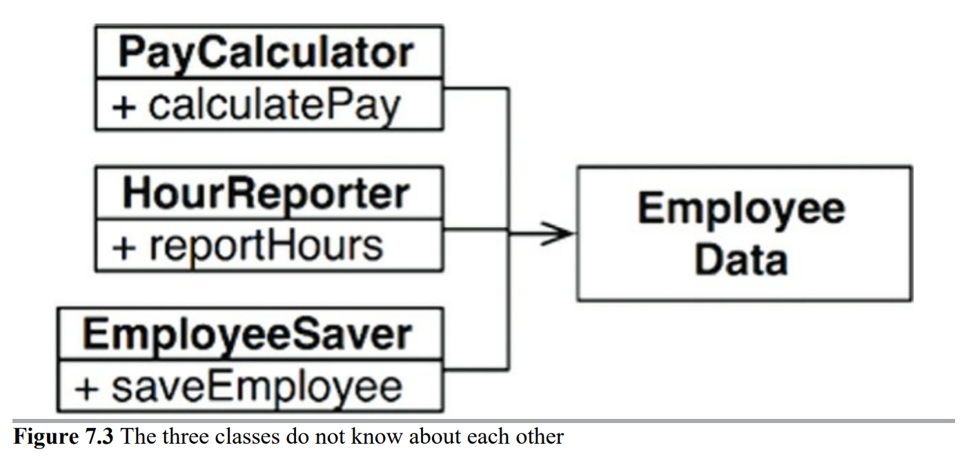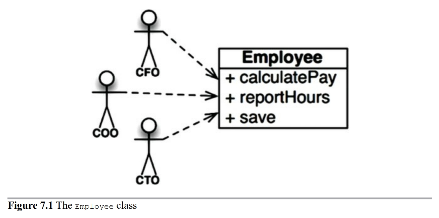 예를 들어, calculatePay() 메서드와 reportHours() 메서드가 초과 근무를 제외한 업무 시간을 계산하는 알고리즘을 공유한다고 해보자. 그리고 개발자는 코드 중복을 피하기 위해 이 알고리즘을 regularHours()라는 메서드에 넣었다고 해보자.