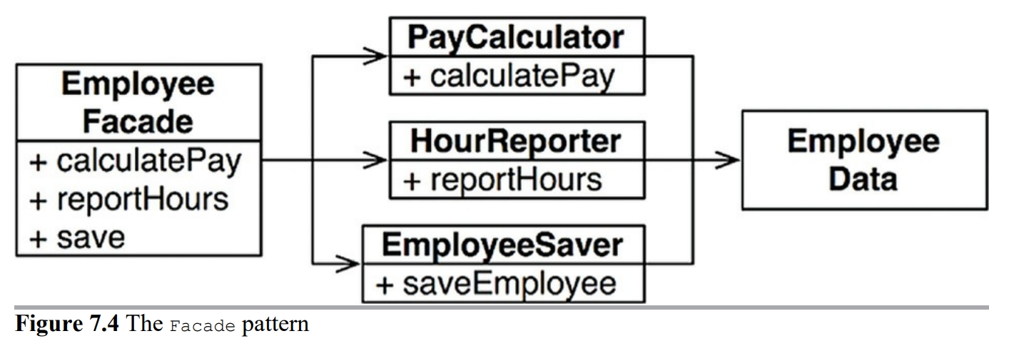 EmployeeFacade에 코드는 거의 없다. 이 클래스는 세 클래스의 객체를 생성하고, 요청된 메서드를 가지는 객체로 위임하는 일을 책임진다.
