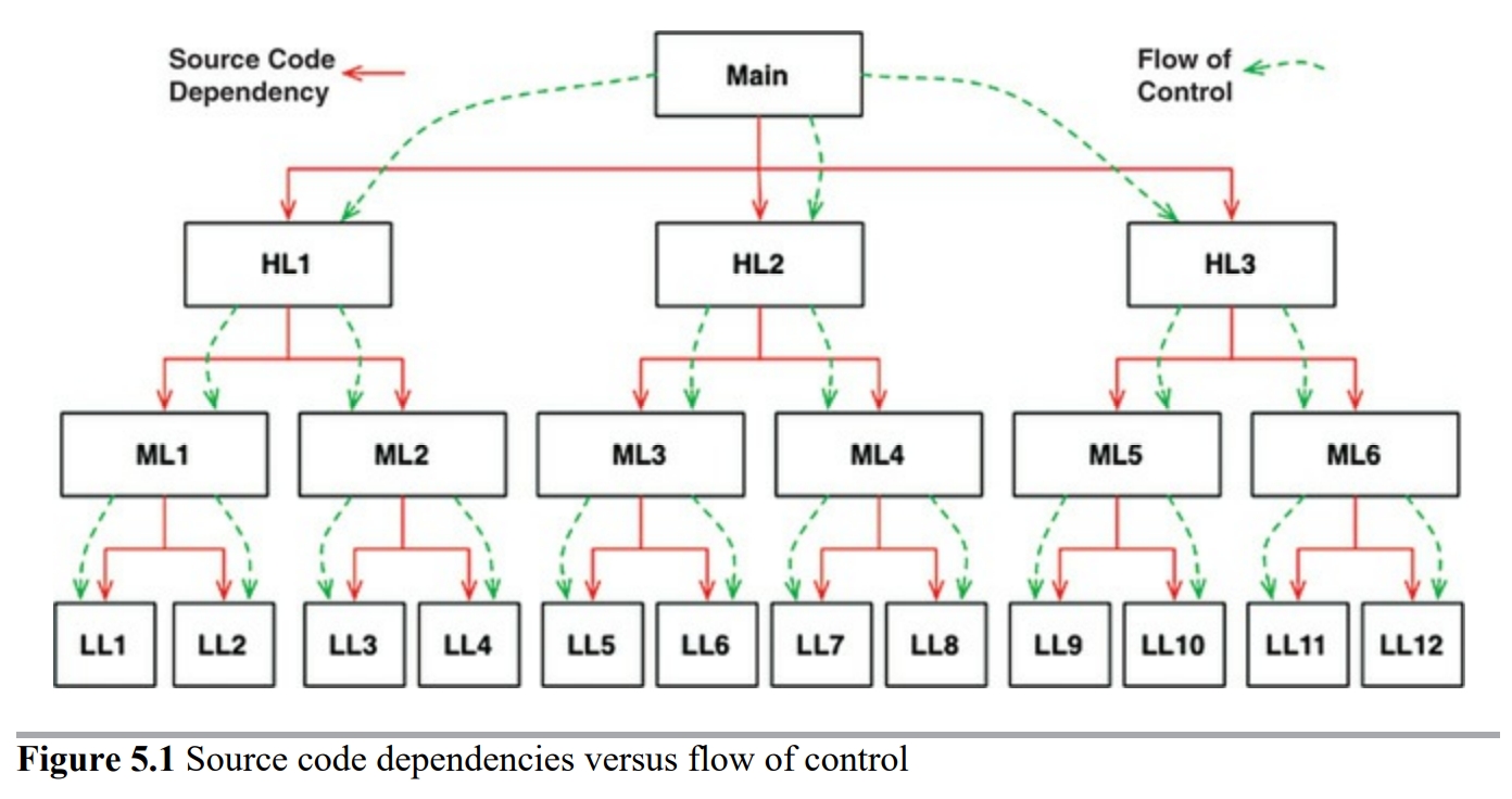 main 함수가 고수준 함수를 호출하고, 고수준 함수는 다시 중간 수준 함수를 호출하며, 중간 수준 함수는 다시 저수준 함수를 호출한다. 이러한 호출 트리에서 소스 코드 의존성의 방향은 반드시 제어흐름을 따르게 된다.