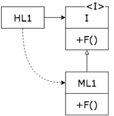 위 그림에서 HL1 모듈은 ML1 모듈의 F() 함수를 호출한다. 소스코드에서는 HL1 모듈은 인터페이스를 통해 F() 함수를 호출한다. 이 인터페이스는 런타임에는 존재하지 않는다. HL1은 단순히 ML1 모듈의 함수 F()를 호출할 뿐이다.