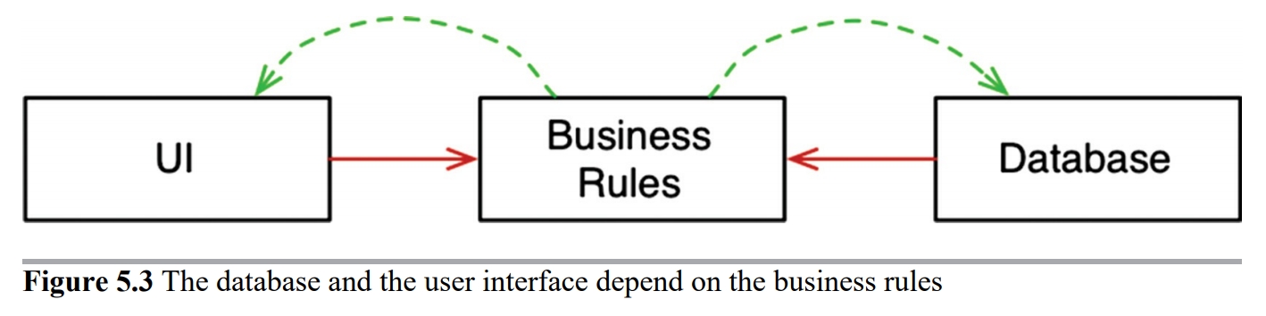 아래 예시 처럼 업무 규칙이 데이터베이스와 사용자 인터페이스에 의존하는 대신에, 시스템의 소스 코드 의존성을 반대로 배치하여 데이터베이스와 UI가 업무 규칙에 의존하게 만들 수 있다.