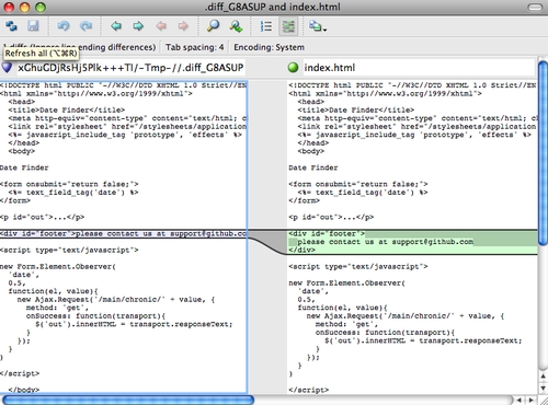 $ git diff 32d1776b1^ 32d1776b1diff 결과가 터미널에 출력되는 대신 P4Merge가 실행된다. 그리고 그림 7-1처럼 그 프로그램 안에서 보여준다: