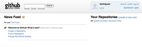그리고 SSH 공개키가 있으면 바로 등록한다. SSH 키를 만드는 방법은 "바로 설정하기" 절에서 이미 설명했다. 그 공개키 파일의 내용을 복사해서 SSH 공개키 입력 박스에 붙여 넣는다. "explain ssh keys" 링크를 클릭하면 key를 생성하는 방법을 자세히 설명해준다. 주요 운영체제에서 하는 방법이 모두 설명돼 있다. "I agree, sign me up" 버튼을 클릭하면 자신만의 대쉬보드 페이지가 나타난다.
