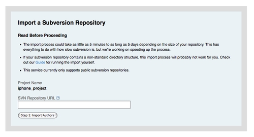 GitHub은 공개 중인 Subversion 프로젝트를 Git 프로젝트로 만들어 준다. 사용설명서 하단에 있는 "Subversion에서 Import하기" 링크를 클릭하면 임포트 폼을 볼 수 있고 거기에 Subversion 프로젝트의 URL을 넣는다(그림 4-9).