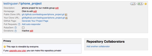 이제 프로젝트가 GitHub에서 서비스되니 공유하고 싶은 사람에게 URL을 알려 주면 된다. URL은 http://github.com/testinguser/iphone_project