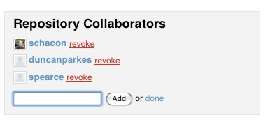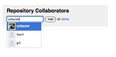 다른 사람에게 쓰기 권한을 주려면 “Add another collaborator” 링크를 클릭한다. 그러면 텍스트 박스가 새로 나타나는 데 거기에 사용자 이름을 입력한다. 사용자 이름을 입력하기 시작하면 자동으로 시스템에 존재하는 사용자를 찾아서 보여 준다. 원하는 사용자를 찾으면 Add 버튼을 클릭해서 그 사용자를 동료로 만든다.