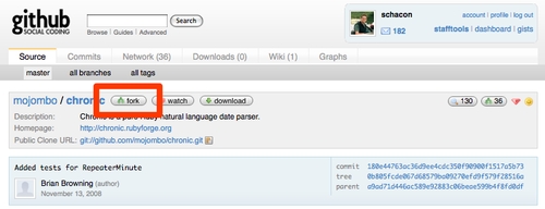 프로젝트 페이지에 들어가서 상단의 "fork" 버튼을 클릭하여 프로젝트를 복제한다(그림 4-14) 그림 4-14의 예는 mojombo/chronic 프로젝트 페이지이다