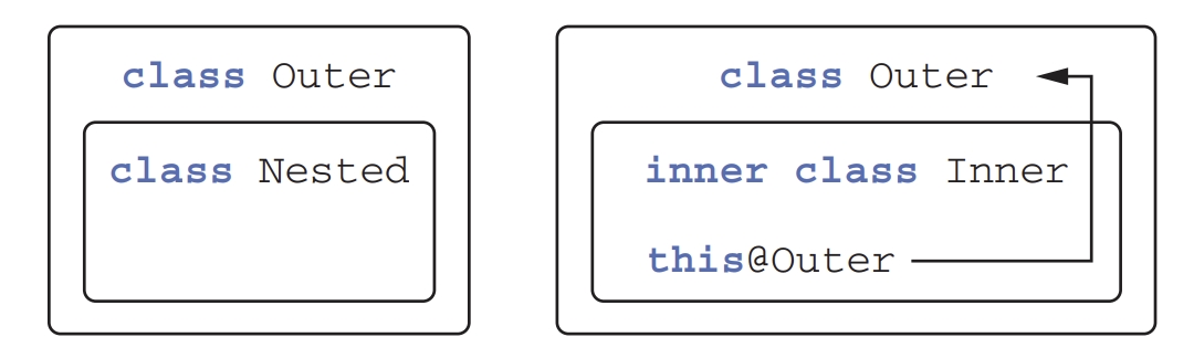위의 그림은 참조를 저장하지 않는 중첩 클래스(왼)와 참조를 저장하는 내부 클래스(오른)의 모습을 나타내고 있다.