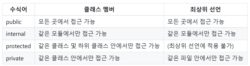 접근자 가시성은 기본적으로 프로퍼티 가시성과 같다. 이때 get이나 set 앞에 가시성 수식어를 추가해 가시성 변경을 할 수 있다.