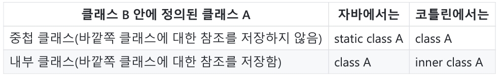 코틀린의 중첩 클래스는 자바의 static 매소드처럼 명시적인 변경자가 없다. 그러나 내부 클래스는 inner라는 변경자를 사용한다. 정리하자면 다음과 같다.
