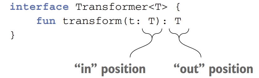 위치로 나뉜다. 만약 T가 함수의 반환 타입에 쓰인다면 T는 아웃