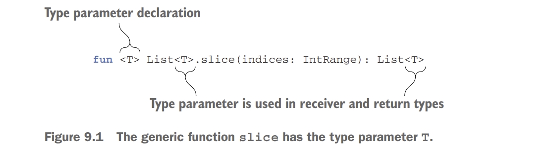와 같이 호출한다면 컴파일러는 타입 파라미터 T가 Char라는 것을 자동으로 추론한다. 즉, letters.slice<Char>(0..2)