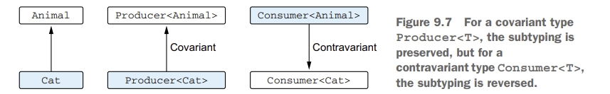 Producer<T>를 예로 공변성 클래스를 설명해보자. A가 B의 하위 타입일 때 Producer<A>가 Producer<B>의 하위 타입이면 Peoducer는 공변적이다. 이를 하위 타입 관계가 유지된다고 한다.