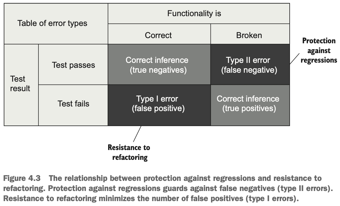 거짓 음성은 회귀 방지로 피할 수 있고, 거짓 양성은 리팩토리 내성으로 최소화 할 수 있다.