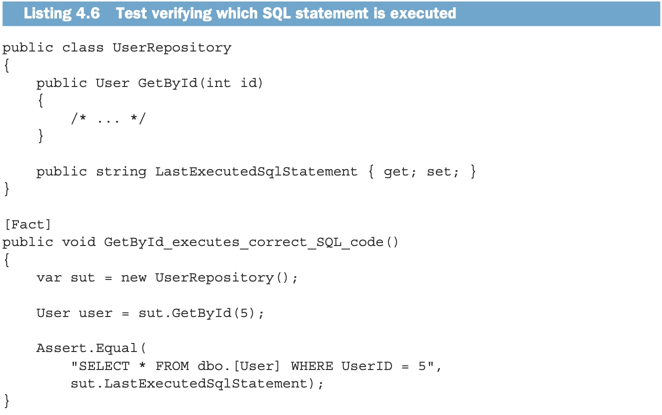 그러나 리팩터링 내성이 좋은가? 아래 SQL 문은 여러 가지 형태로 변경해도 결과는 모두 같다. 위의 테스트는 SUT의 내부 구현 세부 사항에 결합되어 있는 예이다.