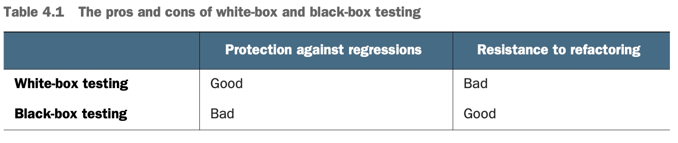 하지만 리팩터링 내성은 포기하면 안된다. 따라서 블랙박스 테스트를 기본으로 선택해야한다. 모든 테스트(단위 테스트, 통합 테스트, 엔드 투 엔드 테스트)가 시스템을 블랙박스로 보게 만들고 문제 영역에 의미 있는 동작을 확인하라.