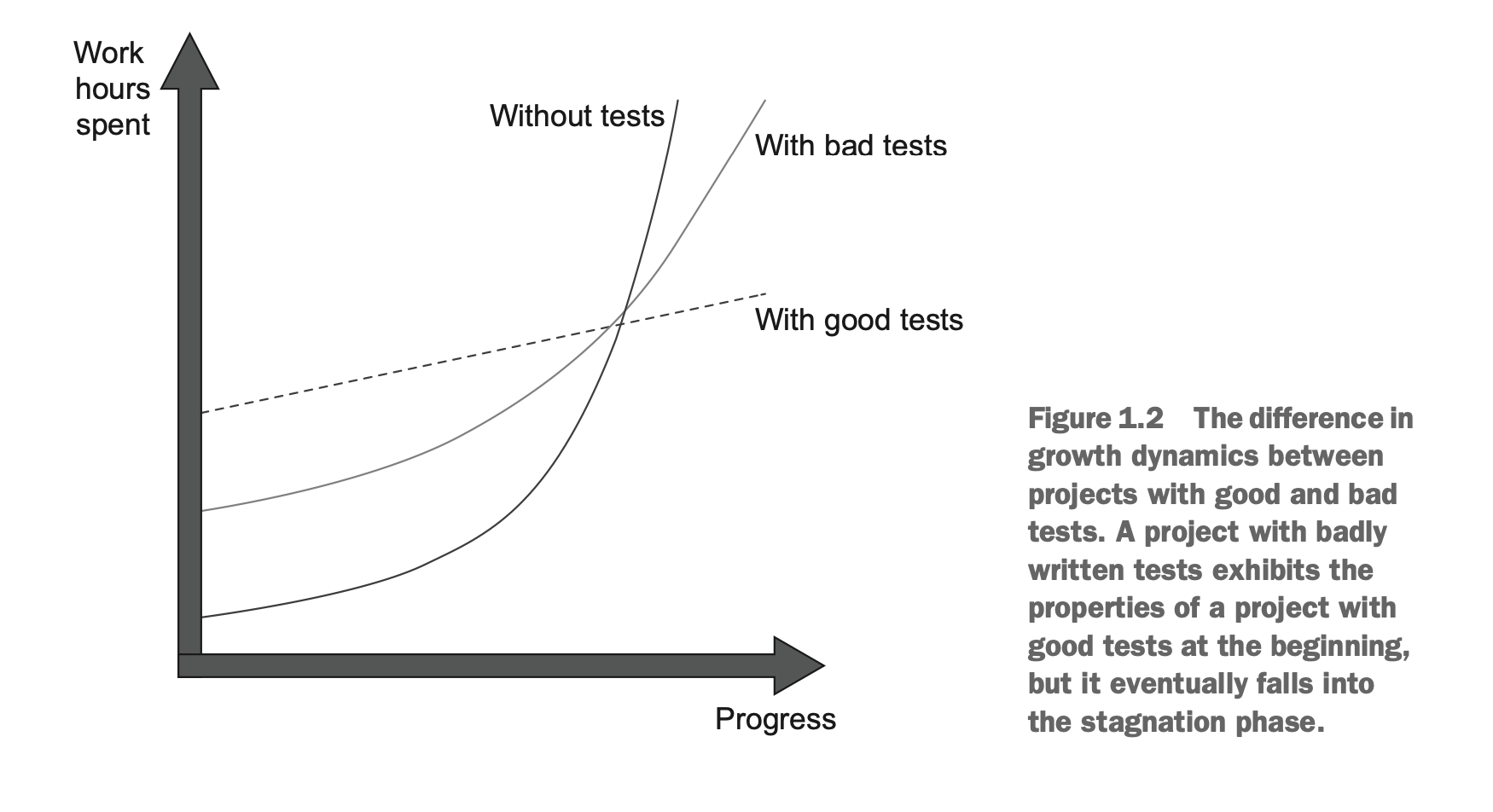 일반적으로 단위 테스트를 작성하면 더 좋은 코드 설계로 이어진다. 하지만 단지 좋은 부수 효과일 뿐 주된 목표는 아니이다. 단위 테스트의 목표는 소프트웨어 프로젝트의 지속 가능한 성장을 가능하게 하는 것이다. 아래 사진을 보면 단위 테스트를 적용했을 때와 적용하지 않았을 때의 개발 속도를 비교할 수 있다.