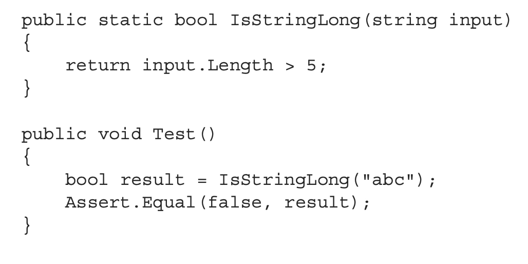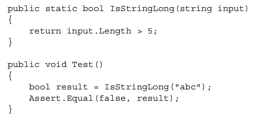 위의 IsSTringLong 메소드를 보면 전체 코드는 중괄호를 포함하여 5줄 인걸 확인 할 수 있다. 그리고 Test 메소드는 전체 코드에서 true를 반환하면 4라인을 커버한다. 즉 코드 커버리지는 4/5 = 0.8 = 80%이다. 하지만 아래와 같이 리팩토링하면 웃기는 결과가 발생한다.