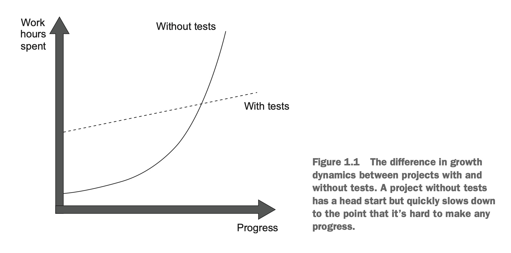 단위 테스트를 적용하는 것은 처음에는 프로젝트를 더디게 할 수 있지만, 단위 테스트를 적용하지 않게 된다면 시간이 지나면서 점점 더 많은 시간을 들여서 개발을 해야한다. 나중에는 결국 개발을 할 수 없는 상황까지 오게된다.\