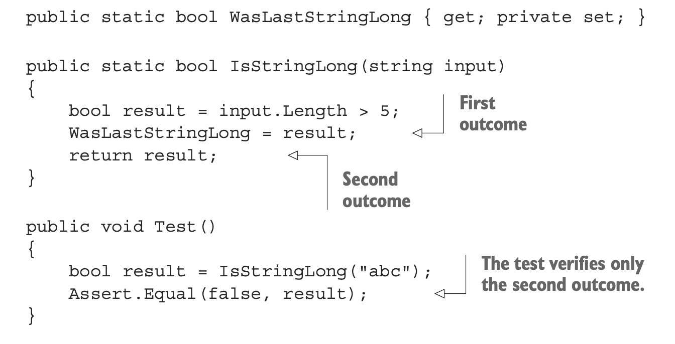 1) 의 내용은 아래의 코드를 보면 WasLastStringLong이 public static 변수로 선언되어 있다. 테스트 코드는 통과하겠지만 WasLastStringLong이 달라진 상황을 모두 테스트했다고 하기 어렵다.