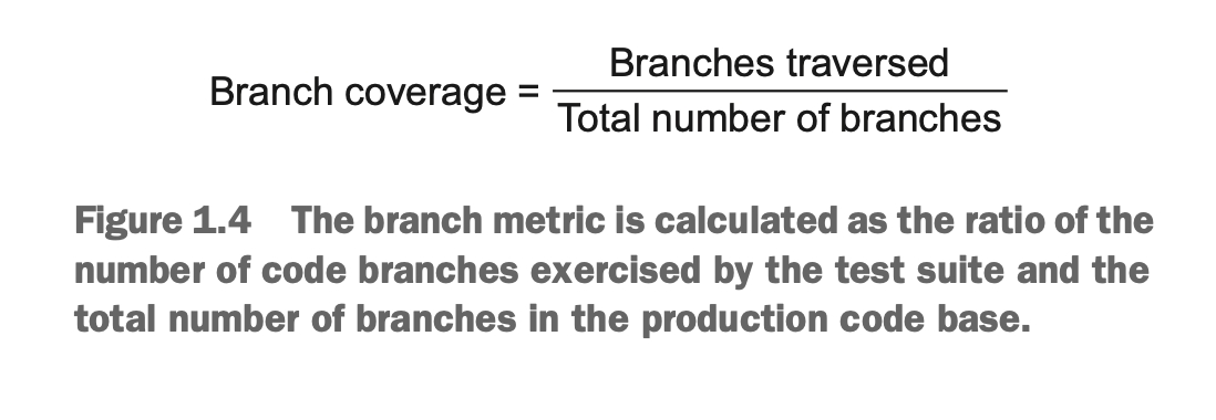예를 들어, 코드 커버리지가 10%처럼 너무 낮은 경우에는 테스트 코드 상태가 좋지다는 근거가 될 수 있다. 반대로 100% 커버리지라도 반드시 양질의 테스트는 아닐 수 있다. 테스트 커버리지는 두 가지 지표로 많이 이야기 된다. 코드 커버리지와 분기 커버리지 이다.