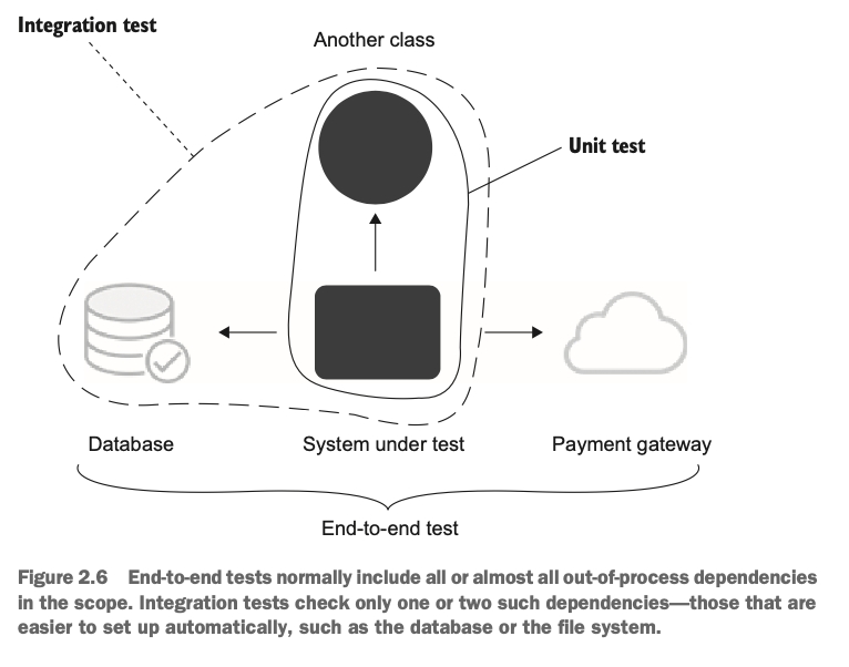 경계가 흐리지만, 일반적으로 통합 테스트는 프로세스 외부 의존성을 한두 개만 갖고 작동하고, 엔드 투 엔트 테스트는 프로세스 외부 의존성을 전부 또는 대다수 갖고 작동한다. 따라서 엔드 투 엔드라는 명칭은 모든 외부 어플리케이션을 포함해 시스템을 최종 사용자의 관점에서 검증하는 것을 의미한다.