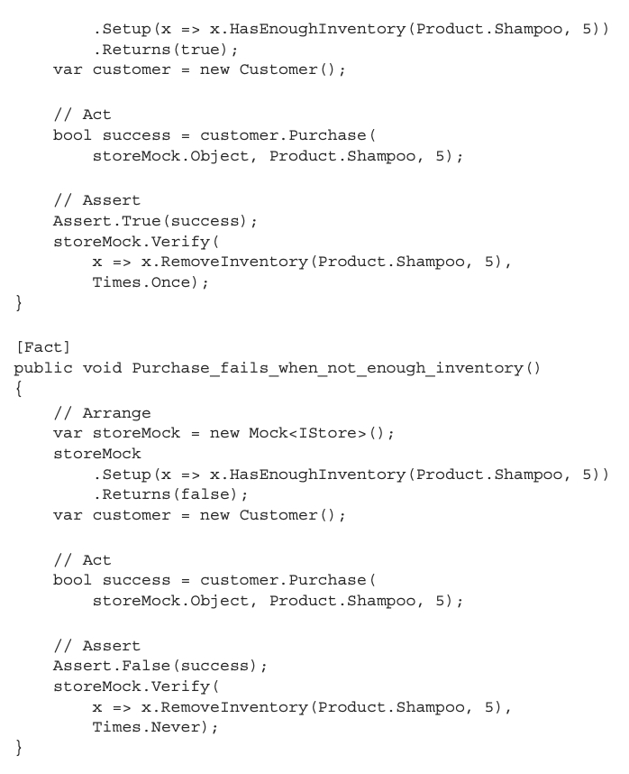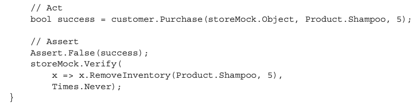 검증 단계에서 고전파 스타일의 코드에서는 상점의 상태를 검증했지만, 런던파 스타일의 코드에서는 Customer와 Store 간의 상호 작용을 검사한다. x.RemoveInventory와 같은 메소드가 호출 되었는지와 횟수까지 검증한다.