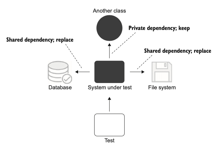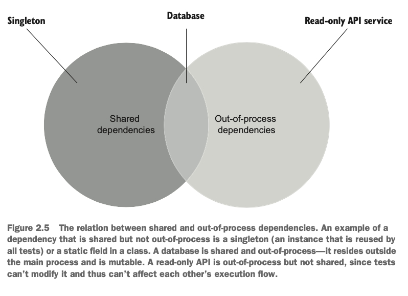 공유 의존성은 테스트 대상 클래스 간이 아니라 단위 테스트 간에 공유한다. 그런 의미에서 싱글턴 의존성은 각 테스트에서 새 인스턴스를 만들 수 있으면 공유 되지 않는다. 테스트에서는 싱글톤을 재사용하지 않는다. 따라서 비공개 의존성이다.