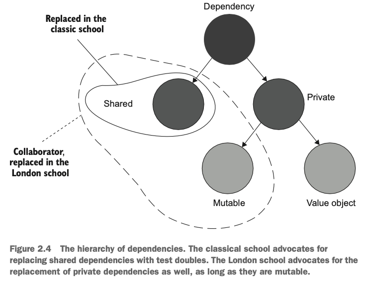 런던파이든 고전파이든 테스트 대역은 어디서나 사용할 수 있다. 하지만 런던파는 테스트에서 일부 의존성을 그대로 사용할 수 있도록 하고 있다.