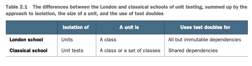 단위 테스트에 대한 정의에는 뉘앙스 차이로 다르게 해석하는 집단들이 있다. 고전파와 런던파이다. 고전파는 단위 테스트와 테스트 주도 개발에 원론적으로 접근하는 방식이고, 런던파는 목(mock)과 스터빙(stubbing) 등을 사용해서 단위 테스트를 주로 작성한다. 단위 테스트의 정의에 있어 꼭 필요한 3가지 속성이 있다.