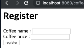 => Register에서, name, price를 가져와 Coffee 클래스를 만든후 => save로 등록 => redirect로 등록된 커피를 볼 수 있는 메소드