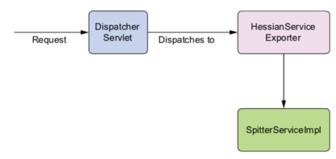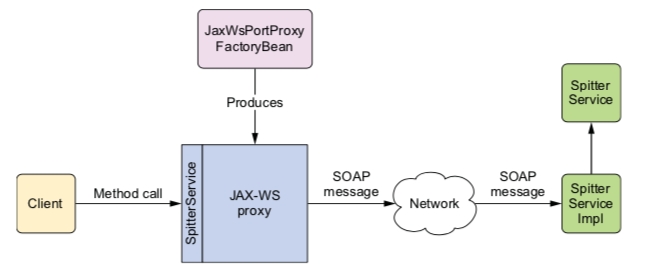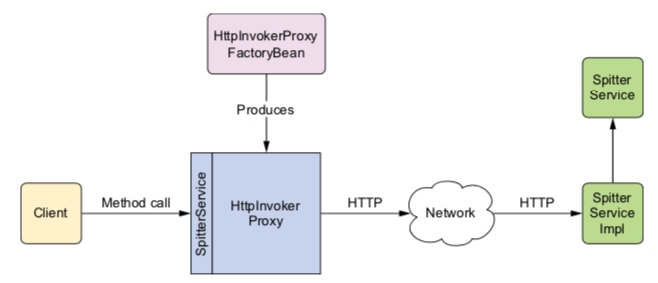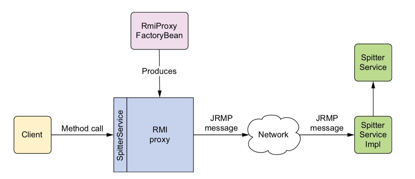 * 빈을 어댑터 클래스 안에 래핑하는 방식으로 작동 -> SpitterService -> 이 어댑터 클래스는, 바인딩된 서비스(SpitterServicelmpl)에 대한 요청을 프록시함