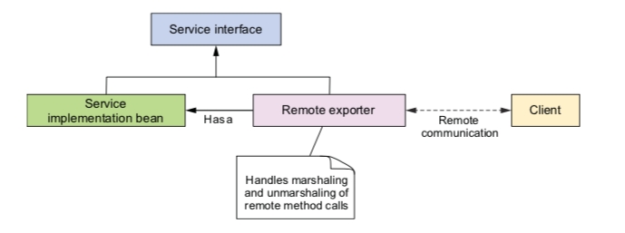 원격 서비스를 소비하는 코드를 개발하거나, 구현하는 코드를 개발하든... 원격 서비스를 이용하는 작업은 단순히 설정상의 문제 -> 리모팅을 위해 자바 코드를 작성할 필요가 없음. 그리고 서비스 빈은 그 빈이 RPC에 참여하는지도 몰라도 괜찮다.