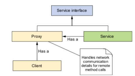 클라이언트는 마치, 프록시가 해당 서비스를 제공하는 것처럼 호출한다. 그러면 프록시가 클라이언트를 대신하여 원격 서비스와 통신. -> 그 이후 연결에 관련된 세부사항을 처리하고, 원격 서비스를 호출