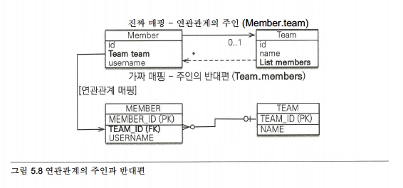의 주인만이 데이터베이스 연관관계와 매핑되고 외래 키를 관리(등록, 수정, 삭제)할 수 있다. 반면에 주인이 아닌 쪽은 읽기만 할 수 있다.