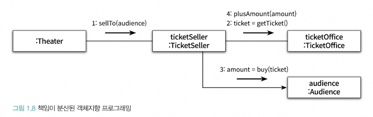 즉, 객체지향은 책임을 분산시킨다. 이전의 절차지향 모델은 Theater에 책임이 몰려있다.