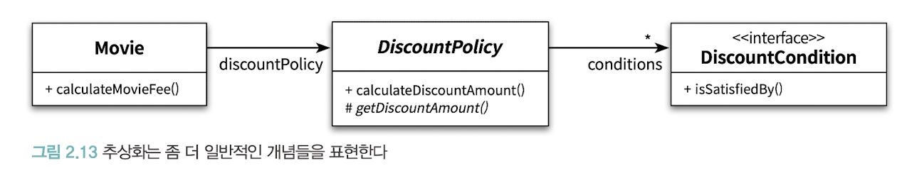 DiscountPolicy 역시 특정 할인 조건에 묶여있지 않다. DiscountCondition을 상속받은 어떤 클래스와도 협력이 가능하다.