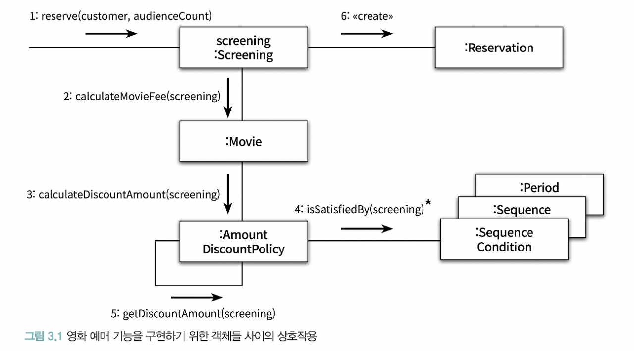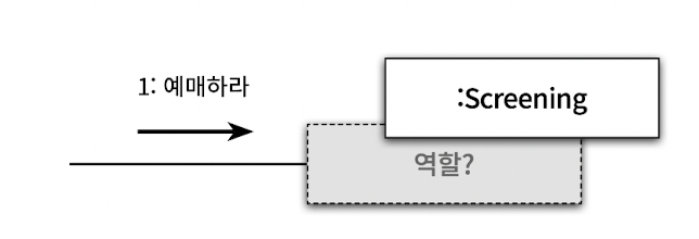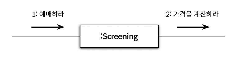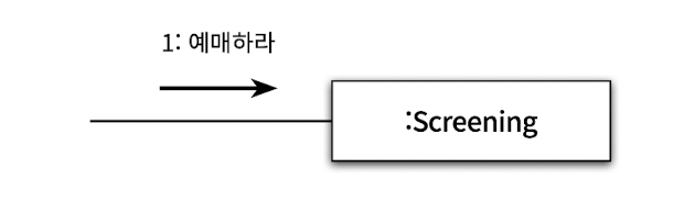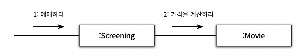 위 다이어그램에서 예메 요금 계산을 위해 Screening은 Movie에게 calculateMovieFee() 메시지를 전송함으로써 1인 요금을 얻는다