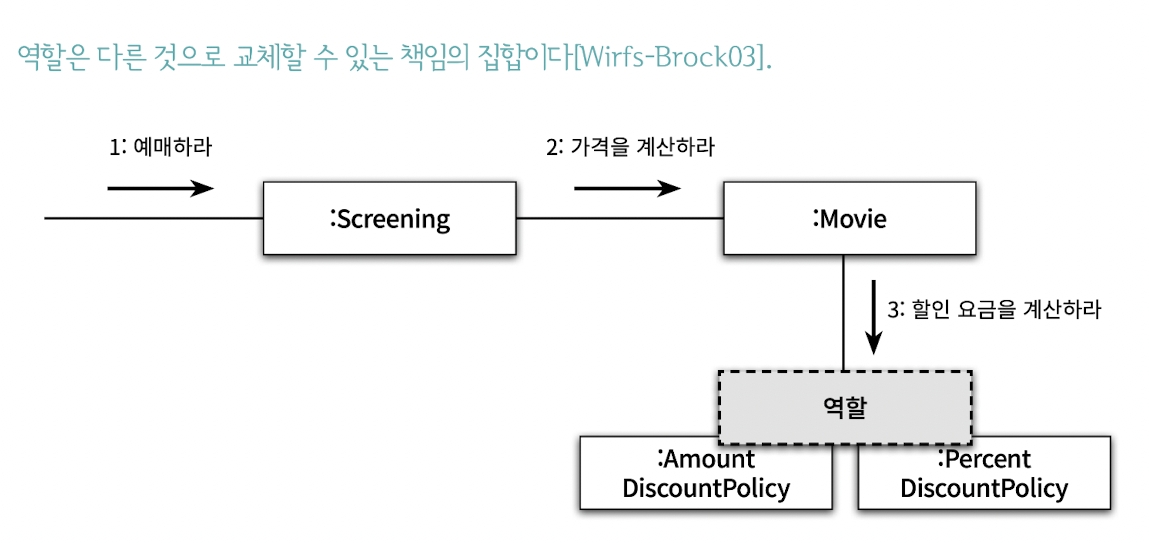 객체들이 협력 안에서 수행하는 책임들이 모여 객체가 수행하는 역할이 된다.