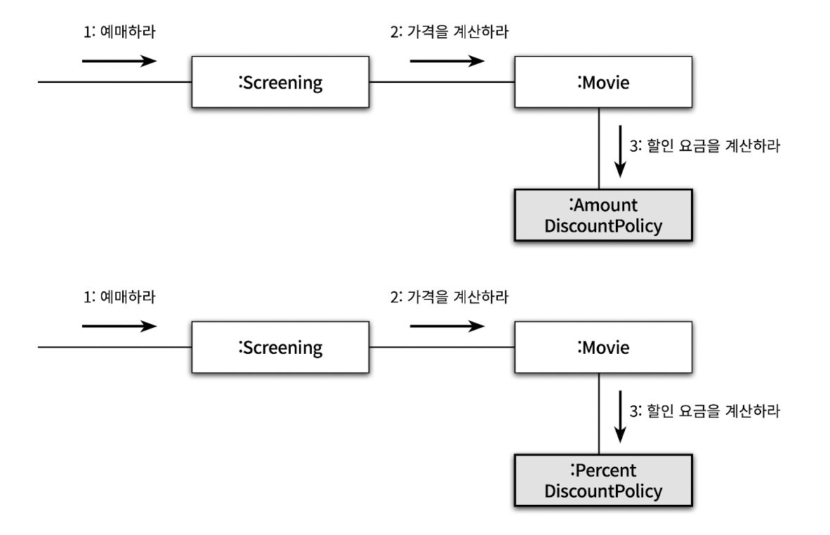 Movie 가 가격을 계산하기 위해 "할인 요금을 계산해라" 라는 메시지를 보내면, AmountDiscountPolicy 와 PercentDiscountPolicy 인스턴스 2가지가 메시지에 응답할수 있다.