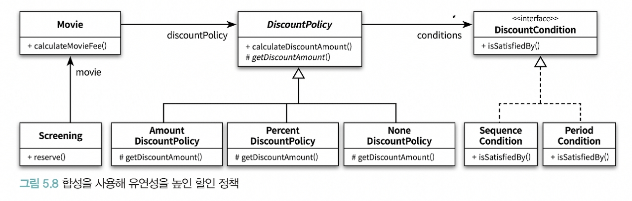 Movie의 관점에서 DiscountCondition 이라는 추상화가 구체적인 타입을 캡슐화 한다는 것은, 새로운 DiscountCondition 타입을 추가해도 Movie는 어떠한 수정도 필요가 없다.