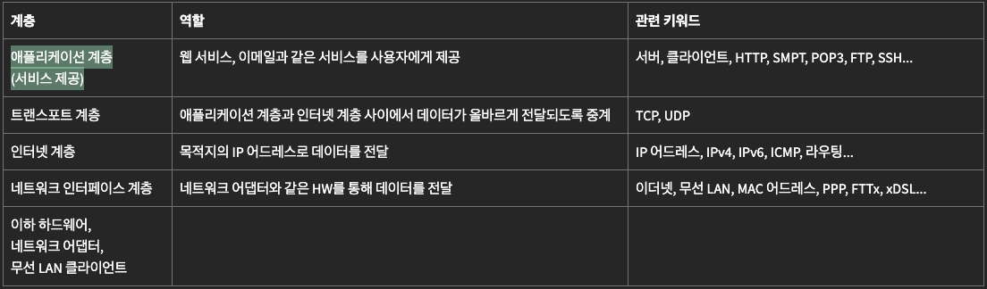 4개 계층 중 서비스의 내용을 결정하는 것은 애플리케이션 계층뿐. 나머지 3개 계층은 데이터를 전달하는 통신 기능을 담당.
