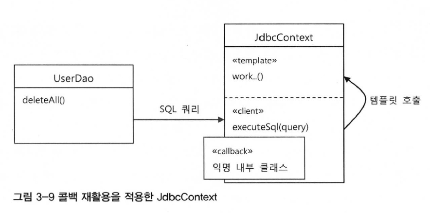 UserDao에서만 사용되기 아까운 재사용 가능한 콜백을 담고있는 executeSql() 메소드를 템플릿 클래스 안으로 옮길 수 있다.
