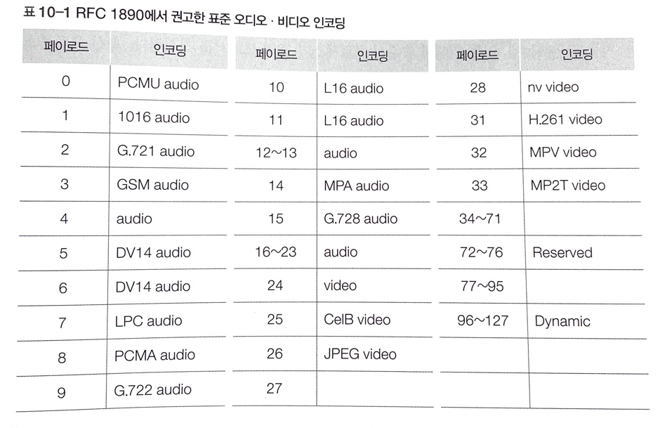 Payload Type(페이로드 유형) - 헤더 다음에 이어지는 RTP 페이로드의 유형을 나타낸다.